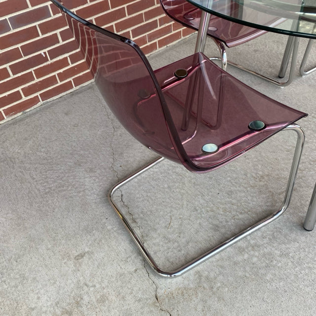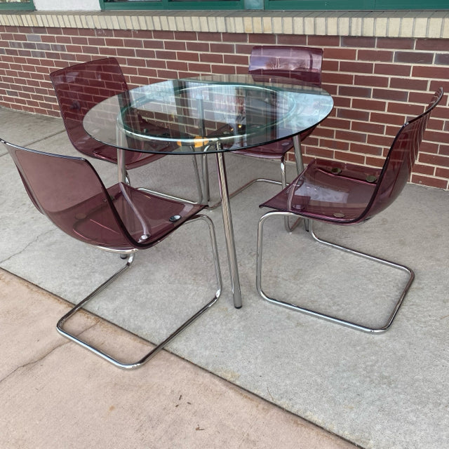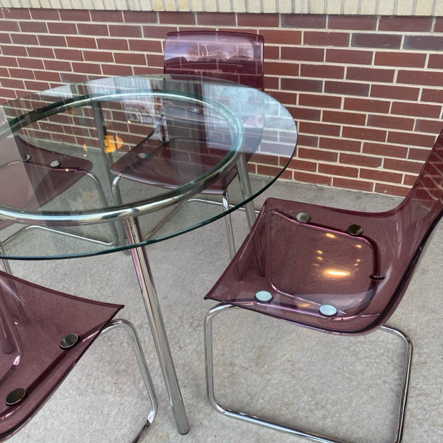 Ikea Clear-Silver Metal-GLass Round Dining Room Table & 4 Pink Acrylic Chairs