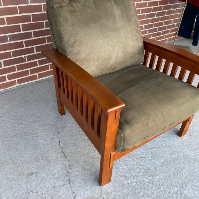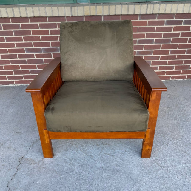 Mission Style Solid Green Microsuede Brown Wood Arm Chair