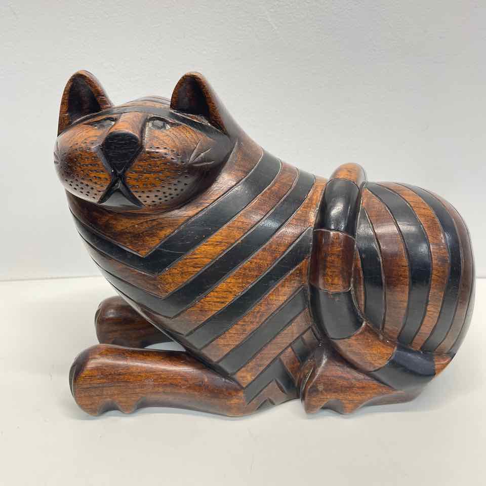 cat figurine. Anglo- indian Hand-carved mahogany. with hidden compartment accessed by a sliding panel on the bottom. 10.5" W x 8.5" H x 5.5" D