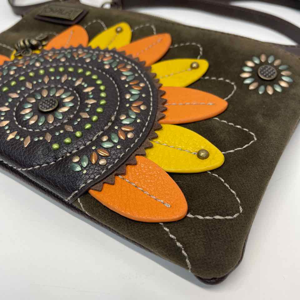 8"W x 6"H. Removable 7" drop handle. Removable adjustable crossbody strap. Zip close. Outer pockets. CC slots. Embellished with leather flower and metal bumblebee. Brown-blue polka dot fabric lining. Brass hardware. As is.
